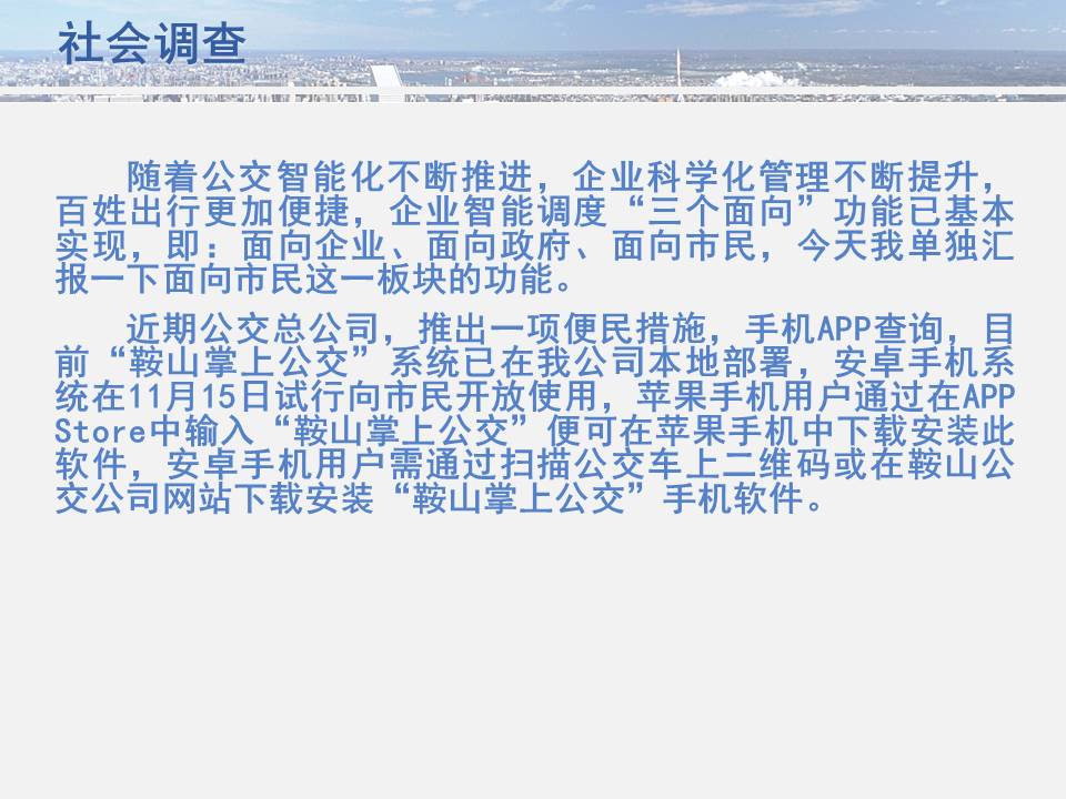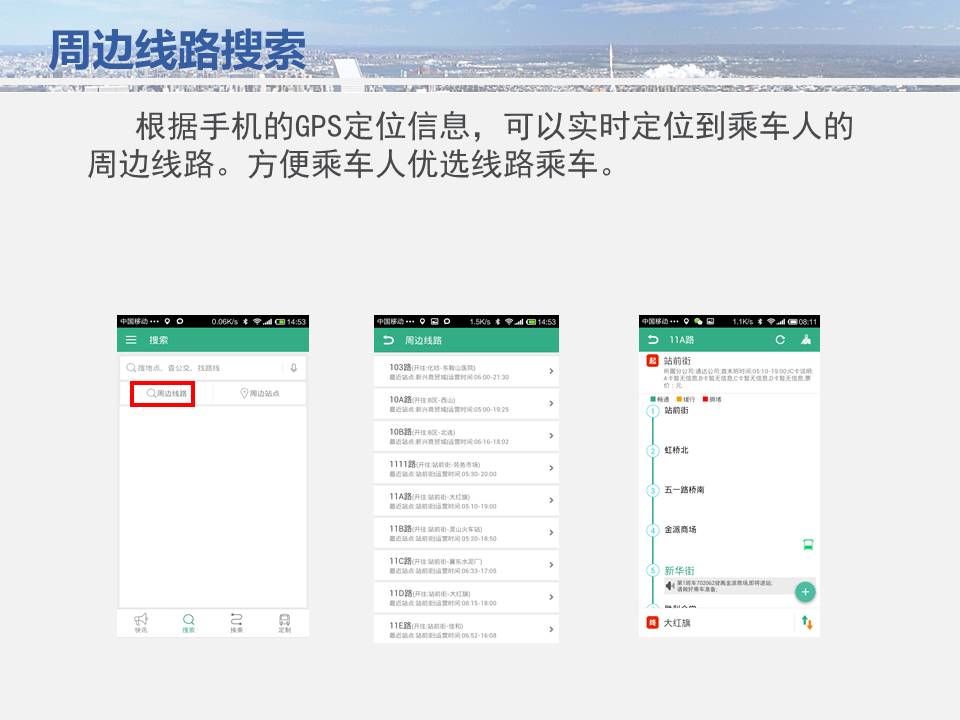 點(diǎn)點(diǎn)手機(jī)就可以看到公交車(chē)目前所在的位置,精準(zhǔn)地掐好出門(mén)時(shí)間,從而避免在惡劣天氣或高峰期苦苦候車(chē),工作人員坐在調(diào)度室內(nèi)就能掌握車(chē)輛在路上的運(yùn)行情況……為方便廣大市民出行,基于安卓平臺(tái)開(kāi)發(fā)的“鞍山掌上公交”官方APP將于11月15日正式上線試運(yùn)行,適用于蘋(píng)果IOS系統(tǒng)的APP將于明年初上線,市民可在公共交通總公司官網(wǎng)下載該軟件,并實(shí)現(xiàn)37條公交線路車(chē)輛實(shí)時(shí)查詢的便利服務(wù)。